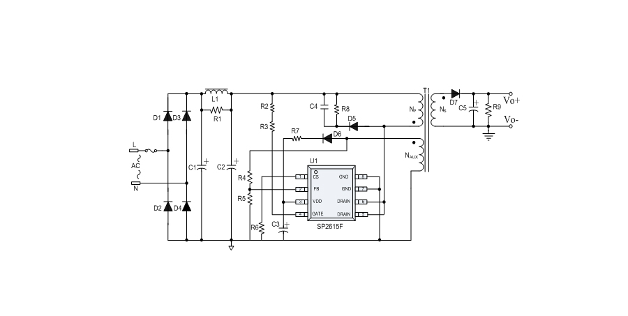 SP2615F提供全面的保護功能,包括逐周期限流保護(OCP)、VDD過壓保護(OVP)、VDD欠壓保護(UVLO)、反饋環路開路保護、輸出短路保護、輸出過壓保護、過溫保護等。其中,輸出短路保護、輸出過壓保護具有自動重啟恢復的功能。