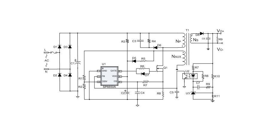 SP6650A是一顆高性能、多工作模式的PWM控制芯片。芯片可以工作在跳頻及綠色模式,以此來減小空載和輕載時(shí)的損耗,也可以工作在QR工作模式及CCM工作模式,提高整機(jī)的工作效率。SP6650A在啟動(dòng)和工作時(shí)只需要很小的電流,可以在啟動(dòng)電路中使用一個(gè)很大的電阻,以此來進(jìn)一步減小待機(jī)時(shí)的功耗。SP6650A內(nèi)置多種保護(hù),包括:輸入電壓過低保護(hù)(Brown-out),輸出電壓短路保護(hù),VDD過壓保護(hù)(OVP),VDD過壓箝位,VDD欠壓保護(hù)(UVLO),過溫保護(hù)(OTP)等。