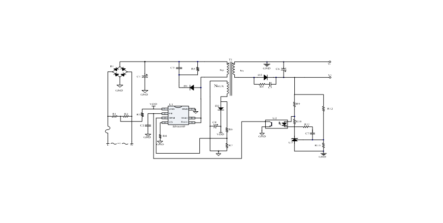 SP6669P是一顆高性能、多工作模式的PWM控制芯片。芯片可以工作在跳頻及綠色模式,以此來(lái)減小空載和輕載時(shí)的損耗,也可以工作在QR工作模式及CCM工作模式,提高整機(jī)的工作效率。SP6669P在啟動(dòng)和工作時(shí)只需要很小的電流,可以在啟動(dòng)電路中使用一個(gè)很大的電阻,以此來(lái)進(jìn)一步減小待機(jī)時(shí)的功耗。SP6669P內(nèi)置多種保護(hù),包括:輸入電壓過(guò)低保護(hù)(Brown-out),輸入電壓過(guò)高保護(hù)(Lineovp),輸出電壓過(guò)壓保護(hù)(VO_OVP),輸出二極管短路保護(hù)(SSP),逐周期過(guò)流保護(hù)(OCP),過(guò)載保護(hù)(OLP),VDD過(guò)壓保護(hù)(OVP),VDD欠壓保護(hù)(UVLO),過(guò)溫保護(hù)(OTP)等。