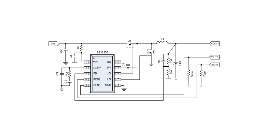 SP1220F是一款同步降壓型PWM控制器,該控制器可驅動雙路輸出8A(4A+4A)負載電流。設計允許SP1220F在9V到40V寬輸入電壓范圍內工作。通過將COMP/EN引腳邏輯電平拉低來實現外部關斷功能,并進入待機模式。外部補償使反饋控制環路具有良好的線壓調整率和負載調整率,且外圍設計靈活。
