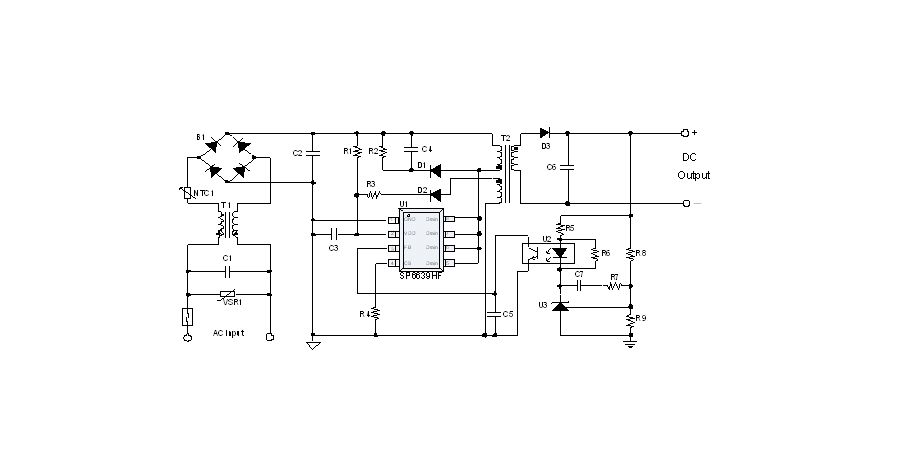 SP6639HF是一顆電流模式PWM控制芯片,內置功率MOSFET,用于功率在27W以內的方案。該芯片在系統輸出空載時工作在跳頻模式,在系統輸出輕載到中等負載階段工作在PFM模式,在輸出重載時工作在最大恒定工作頻率。SP6639HF的啟動電流和工作電流設定的比較小,以此減小待機時的功耗。芯片內置有斜坡補償電路,避免次諧波振蕩的發生,改善系統的穩定性。芯片內置有前沿消隱時間(Leading-edge blanking time),消除緩沖網絡中的二極管反向恢復電流對電路的影響。該芯片帶有抖頻功能,能夠有效改善系統的EMI性能。芯片最低的工作頻率設置在音頻以上,在工作時可以避免系統產生噪音。SP6639HF內置多種保護,包括逐周期限流保護(OCP),過壓保護(OVP),VDD過壓箝位,欠壓保護(UVLO),過溫保護(OTP)等,通過內部的圖騰柱驅動結構可以更好的改善系統的EMI特性和開關的軟啟動控制。