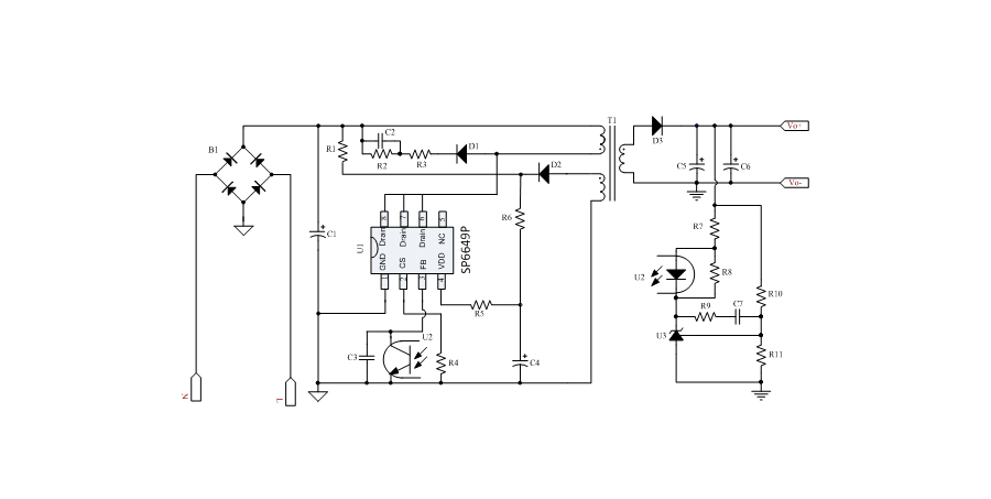 SP6649P內置多種保護,包括逐周期限流保護(OCP),過載保護(OLP),過壓保護(VDD OVP),VDD過壓箝位,欠壓保護(UVLO),過溫保護(OTP)等,通過內部的圖騰柱驅動結構可以更好的改善系統的EMI特性和開關的軟啟動控制。