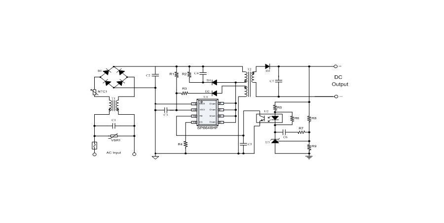 SP6648HF是一顆電流模式PWM控制芯片,內置650V高壓功率MOSFET,應用于功率在18W以內的方案。SP6648HF在PWM模式下工作于固定開關頻率,這個頻率是由內部精確設定。在空載或者輕載時,工作頻率由IC內部調整。芯片可以工作在綠色模式,以此來減小輕載時的損耗,提高整機的工作效率。SP6648HF在啟動和工作時只需要很小的電流,可以在啟動電路中使用一個很大的電阻,以此來進一步減小待機時的功耗。芯片內置有斜坡補償電路,當電路工作于大占空比時,避免次諧波振蕩的發生,改善系統的穩定性。內置有前沿消隱時(Leading-edge blanking time),消除緩沖網絡中的二極管反向恢復電流對電路的影響。SP6648HF采用了抖頻技術,能夠有效改善系統的EMI性能。系統的跳頻頻率設置在音頻(22KHz)以上,在工作時可以避免系統產生噪音。SP6648HF內置多種保護,包括逐周期限流保護(OCP),過載保護(OLP),過壓保護(VDD OVP),VDD過壓箝位,欠壓保護(UVLO),過溫保護(OTP)等,通過內部的圖騰柱驅動結構可以更好的改善系統的EMI特性和開關的軟啟動控制。