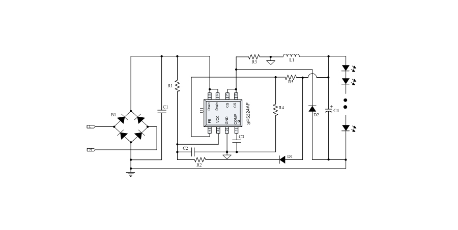 SP5324AF是一款非隔離降壓型單級PFC高性能LED照明轉(zhuǎn)換電路,內(nèi)置550V高壓MOSFET,具有應用外圍器件極少,設計簡單,功率因數(shù)高,恒流精度高等優(yōu)點。采用準諧振開啟的控制方式,提升了轉(zhuǎn)換效率。外圍應用采用浮地架構,實現(xiàn)對電感電流進行全周期采樣,得到極高的恒流精度。