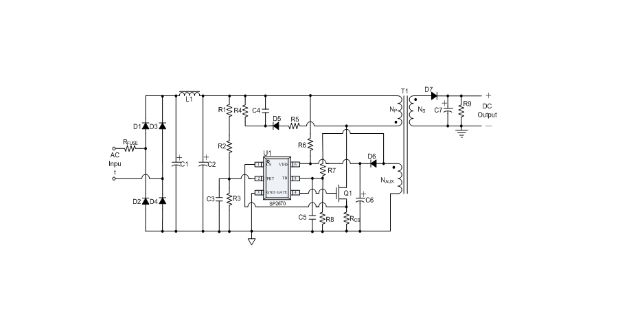 SP2670 offers comprehensive protection coverage with auto-recovery feature including Cycle-by-Cycle current limiting, VDD over voltage protection (OVP), FB over voltage protection, load short circuit protection, VDD under voltage lockout (UVLO), Brown out protection , Line over voltage protection ,OTP etc.