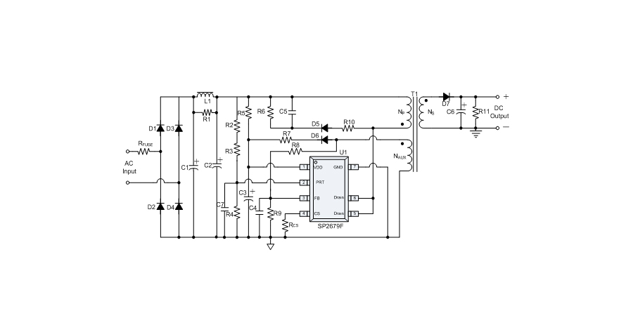 SP2679F offers comprehensive protection coverage with auto-recovery feature including Cycle-by-Cycle current limiting, VDD over voltage protection (OVP), FB over voltage protection, load short circuit protection, VDD under voltage lockout (UVLO), Brown out protection , Line over voltage protection ,OTP etc.
