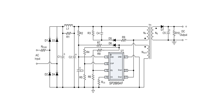 SP2695AF is a high performance offline PSR power switch for low power AC/DC charger and adapter applications. It operates in primary-side sensing and regulation. Thus, opto-coupler and TL431 are not required. In CC control, the output current and power setting can be adjusted externally by the sense resistor RCS at CS PIN. In CV control, multi-mode operations are utilized to achieve high performance and high efficiency. In addition, good load regulation is achieved by the built-in cable drop compensation. SP2695AF operates in PFM in CC mode, and it operates in PWM+PFM in CV mode with frequency reduction at light/medium load. The chip consumes very low operation current. It achieves less than 75mW standby power to meet all global energy efficiency regulations.